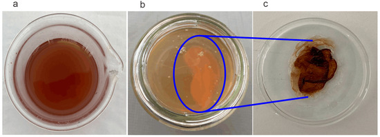 Figure 3 shows the images of anacardic acid without electrochemical treatment (Figure 3a), the organic acid mixture solution resulting after electrochemical treatment (Figure 3b), and the polymeric material generated (Figure 3c). The initial anacardic acid solution is a dark-brown solution that, after electrochemical treatment, becomes a clear amber solution with a precipitate at the bottom that corresponds to the polymeric fraction formed.