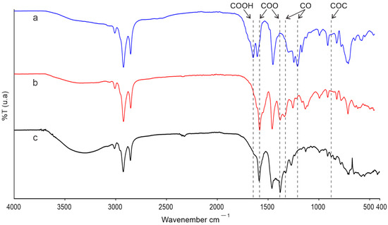 Infrared spectroscopy spectra of anacardic acid before (a) and after (b) electrochemical treatment, and (c) polymeric material.