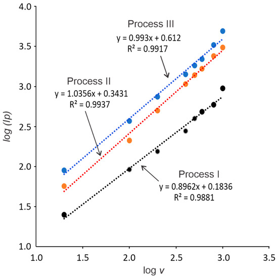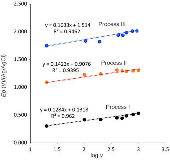 Figure 7 shows a graph of the oxidation peak potentials (Ep) versus the logarithm of the scan rates (log v). It can be observed that the peak potentials have a linear relationship with respect to the logarithm of the scan rates, establishing the equation , with R2 of 0.962, 0.939 and 0.946 for processes I, II, and III, respectively. It has been established that in irreversible electrochemical reactions, the peak potential varies with the scan rate according to the Laviron equation [29]:
