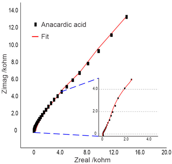 The analysis carried out by electrochemical spectroscopy is presented in Figure 9 by a Nyquist graph. It can be observed that when magnifying in the high-frequency zone, an inductive process is observed, which is suggested by values below zero. In addition, in the magnification, depressed semicircular curves are observed in the signals. The partial semicircles can be related to the Faradaic current of the oxidative processes of the anacardic acid molecules and superficial capacitive phenomena. In addition, impedance grows in an almost linear manner with the imaginary component, suggesting a diffusive response. The red fitting curve represents the trend of the experimental data well, which indicates that the equivalent model used fits well.