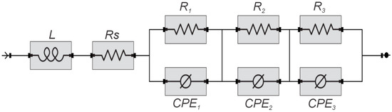 The equivalent circuit consists of an inductor element L connected in series to a resistor Rs followed in series by three systems composed of pairs of constant phase elements (CPE 1, CPE 2, and CPE 3) connected in parallel with their resistors (R1, R2, and R3). The equivalent circuit model corresponds to L-Rs-[(R1/CPE1)-(R2/CPE2)-R1/CPE3)]. The representation of the equivalent circuit is presented in Figure 10.