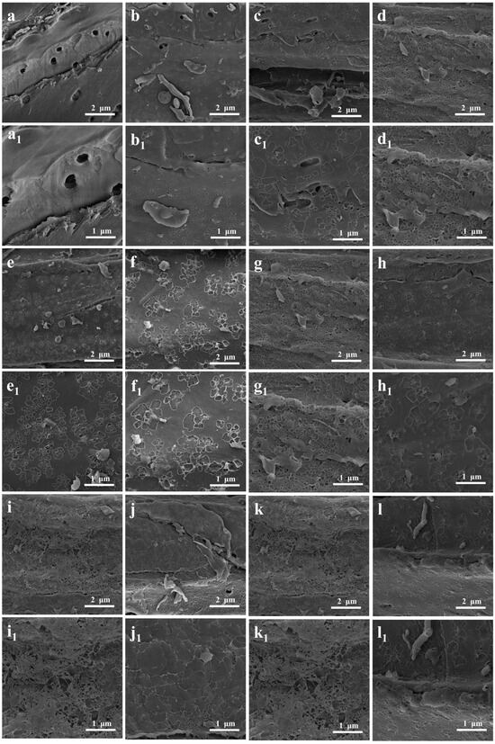 Figure 4a shows that the surface of the SFSP contained pits; nevertheless, the surface was overall smooth and had a low roughness. Meanwhile, the surface of the SFBC carbonized at 500 °C was rough and contained pores of different sizes (Figure 4b). After activation with KOH, even more irregular pore structures formed on the surface of the KBC, making the surface even rougher (Figure 4c–l). This result was attributed mainly to KOH, which damaged the fibers of the sunflower straws, and the uneven release of a large number of volatile substances, which damaged the surface of the SFBC [39]. Thus, activation with KOH increased the SSA and improved the pore structure of the SFBC (Figure 4(a1–l1)).