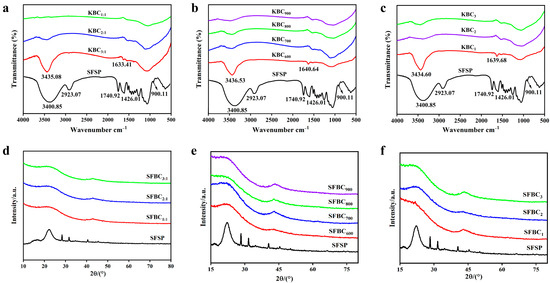 FTIR spectra and XRD patterns of KBC. (a–c) FTIR spectra of samples with different impregnation ratios, activation temperatures, and activation time, (d–f) XRD patterns of samples with different impregnation ratios, activation temperatures, and activation time.