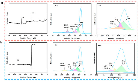 To further explore the composition and changes in chemical functional groups, the SFBC and KBC were characterized by X-ray electron spectroscopy (XPS) (Figure 6). From the full spectra of the XPS, it could be seen that SFBC and KBC mainly contained two different elements: C and O. In order to further understand the composition of the SFBC and KBC, the functional groups of C and O were analyzed. The C1s spectra exhibited four main peaks: COOH (288.9 eV), C=O (286.4 eV), C–O (285.7 eV), and C–C (284.6 eV) [46]. The O1s spectra showed three main peaks: C–O–C (533.9 eV), O–H (533.2 eV), and C–O (532.2 eV). These results were consistent with the FTIR spectroscopy results. Compared with SFBC, the peaks corresponding to the C–O (285.7 eV), C=O (286.4 eV) and COOH (288.9 eV) bonds of the KBC were significantly weakened, while the peaks corresponding to C–C (284.6 eV) were wider. This indicated that the degree of graphitization was enhanced and the aromatic structure was enhanced. Moreover, the peak intensity corresponding to O–H (533.2 eV) was also weakened, indicating that the content of –OH was reduced after high-temperature activation. In general, high-temperature activation at 900 °C was beneficial to the graphitization degree of the biochar and reduced its content of oxygen-containing functional groups.