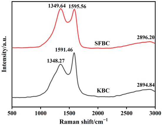 Figure 7 shows the Raman spectra of the SFBC and KBC. The Raman spectra of the SFBC and KBC exhibited characteristic D and G peaks near 1350 and 1590 cm−1, respectively. The D peak represented condensed benzene rings in the biochar and the degree of defects in the C atomic structure. Meanwhile, the G peak represented sp2-hybridized C atoms in the biochar materials, reflecting the crystallinity and crystal symmetry of the biochar materials [47]. The ID/IG ratio reflected the degree of graphitization of the biochar materials [48]. It could be seen that the ID/IG ratio of SFBC was larger, indicating that the SFBC was mainly composed of amorphous carbon [49]. However, the D-peak intensity of the KBC sample decreased and the intensity of G peak increased and became sharp, which indicated that the ratio of ID/IG decreased after high-temperature activation. It could be found from the figure that the ratio of ID/IG was less than 1, indicating that the graphitization degree of the KBC increased. KBC exhibited a broad characteristic peak around 2890 cm−1, indicating the formation of graphitized structures during activation.