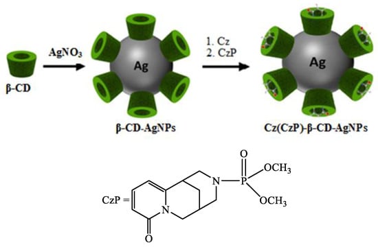 Cyclodextrins (α-, β- and γ-CD) are natural cyclic oligosaccharides formed by the degradation of natural starch. CD can serve as a good reagent for the reduction of metal salts and bind to the surface of nanoparticles by chemisorption. β-CD plays an important role in preventing the aggregation of nanoparticles, thus contributing to their stability in solution. For example, they have been successfully used in the preparation of Ag and Au nanoparticles [17,18,19,20,21] due to their good solubility in water [22,23,24,25]. A. Abu-Okeil et al. [26] used aminated β-CD to obtain AgNPs with particle sizes in the range of 1–9 nm. The hydrophobic cavity and unique ionic effects of cyclodextrins expand their application in drug delivery and solubilization [27,28,29,30]. In our previous study, we described the preparation and some features of the encapsulation mechanism of Cz with α-, β- and γ-CD [31,32]. The present study demonstrates the preparation and thermochemical characterization of encapsulated inclusion complexes of Cz and its phosphate derivative as organic ligands with AgNPs. The modified Cz(CzP)-AgNP compositions can be considered as a promising platform for improving the stability and expanding their potential in biomedical applications (Figure 1).