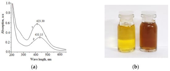 The scientific literature describes many physico-chemical and “green green” methods for the production of AgNP nanocomposites involving various polymeric substances (PVP, PEG et al.) [33], oligosaccharides (α-, β- and γ-CD) [16,17,18,19,20,21], etc. CDs can be used in the production of nanocomposites and metal nanoparticles, because they can affect the characteristics of nanoparticles, such as drug loading, solubility, stability and bioavailability [33,34]. CDs have a unique ability to reduce Ag+ ions to metallic AgO and prevent agglomeration of the resulting AgNPs [34,35,36,37]. The method described here at the first stage included the reduction of the [Ag(NH3)2]+ complex to metallic AgO with an aqueous solution of β-CD. The initial concentrations of the reaction components were 0.003 mol/L and 0.05 mol/L for AgNO3 and the reducing agent, respectively. The ammonia concentration ranged from 0.005 to 0.01 mol/L. The color of the solution gradually changed from colorless to pale yellow, which intensified and subsequently changed to intensely yellow-brown, indicating the formation of AgNP nanoparticles [38,39]. With a further increase in the reaction time and pH of the solution, the color of the solution changed to dark brown, and then to gray. These observations show that as the reaction time increases, the particle size and aggregation of silver nanocrystals gradually increase. All measurements were carried out at room temperature (≈20 °C).