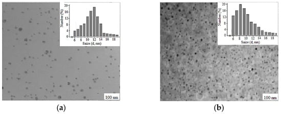 The synthesized Cz(CzP)-β-CD-AgNPs showed a typical plasma band at wave lengths of 423.30 and 433.15 nm, which confirms the production of spherical nanoparticles of the composition [34,35]. TEM was performed to monitor the morphology, size and dispersion of the obtained Cz-β-CD-AgNPs. Figure 3 shows the TEM image which shows that Cz-β-CD-AgNP have a mostly subspherical shape. The histogram showed a narrow particle size distribution (in a solution with a pH of 9), since the particle size was concentrated in the range from 6 to 20 nm, with an average particle size of 11.78 ± 1.03 nm. In a solution with pH12, the nanoparticle size distribution is more narrowly dispersed, with a predominant number of nanoparticles (87%) in the range of 6–12 nm.