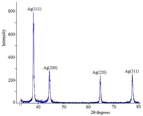 The synthesized nanoparticles were also characterized by X-ray diffraction (XRD) (Figure 4). The peaks on the X-ray image confirmed that the AgNPs had a face-centered cubic shape, while the peaks of the contaminated crystalline phases could not be detected.