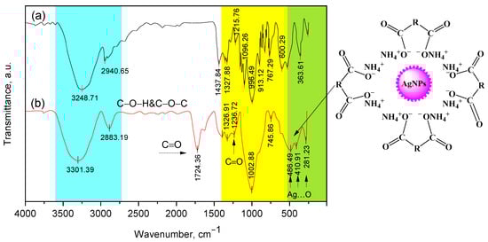 IR Fourier spectra for β-CD (a) and Cz−β-CD−AgNPs (b). The different colors in the figure show the characteristic areas of the absorption bands of various functional groups in the structure of compounds.