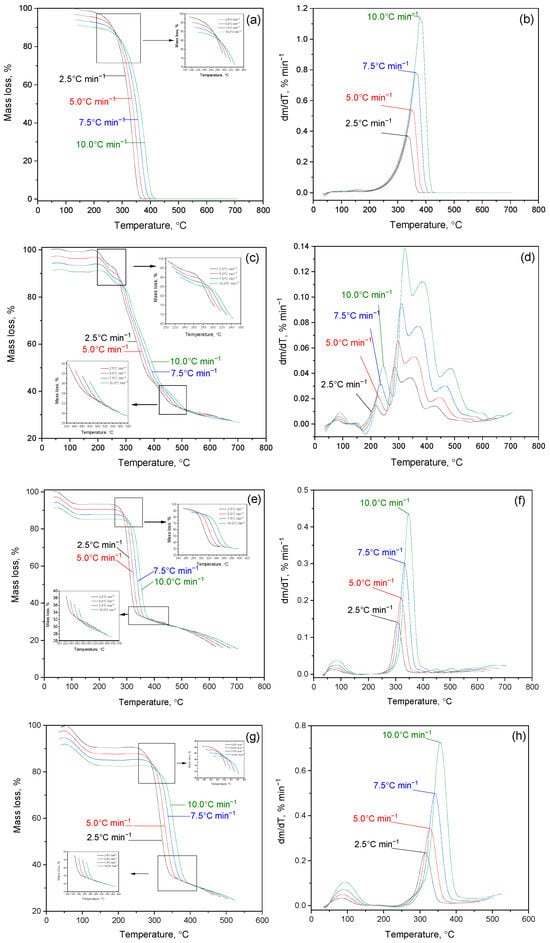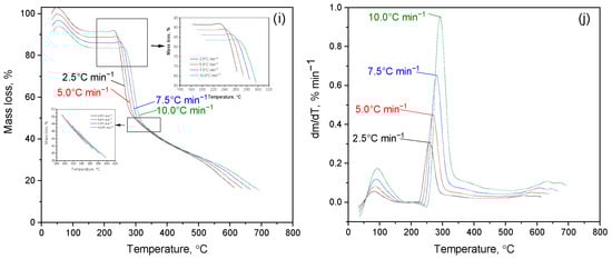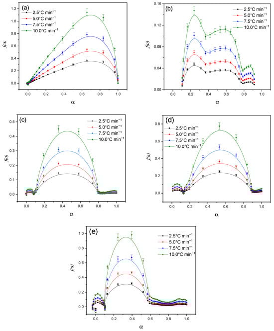 Figure 16 shows the dependence of the reaction rate (dα/dt) on the degree of conversion (α) for different heating rates (2.5 °C min−1, 5.0 °C min−1, 7.5 °C min−1, 10.0 °C min−1). The obtained data demonstrate a characteristic reaction profile, in which the reaction rate increases with increasing degree of conversion up to a certain maximum (0.4–0.60) and then decreases as the process is completed (α→1). With increasing heating rate, the peak of the reaction rate shifts to the region of higher α values, which is associated with a change in the energy barriers of the process.