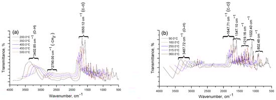 The result of this process is the formation of various fragments and destruction products caused by the destruction of the complex structure. Thermal destruction of the Cz-β-CD complex is subject to the mechanism of sequential rupture of bonds and the release of the components of the complex from the cavity of the β-CD molecule. For the inclusion complexes Cz(CzP)-β-CD modified with silver nanoparticles AgNPs, a similar behavior is observed at the initial stages of heating (Figure 6g–i). The first peak in the DTG curve (Tterm (I) = 100 °C) is associated with the removal of water located inside the β-CD cavity. At Tterm (II) = 280–440 °C, a sharp mass loss is observed in the TG curves (Δm = 74% for Cz-β-CD-AgNPs and Δm = 62% for CzP-β-CD-AgNPs), which corresponds to the final decomposition of the Cit(Citaf)-β-CD-AgNPs inclusion complexes. This subsequently leads to the destruction of the β-CD structure and the removal of volatile decomposition products. During further heating above 500 °C, stabilization of heat-resistant residues such as silver nanoparticles is observed (Figure 6i,j). These findings are also confirmed by the results of IR spectroscopic analysis (Figure 7a–e).