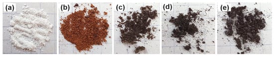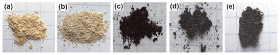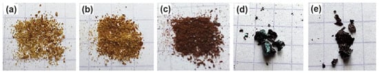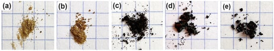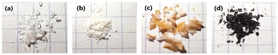 The following photographs (Figure 9) show fragments of annealed CzP obtained at different heating temperatures. CzP annealed at a low temperature (90 °C) exhibits transparent crystals (Figure 9a). At a heating temperature of 160 °C, a more homogeneous white powder was obtained (Figure 9b). CzP annealed at a high temperature (250 °C) is distinguished by a yellowish color and a larger fraction. This indicates the initial stages of decomposition of the material (Figure 9c). The crystals appear to be quite large and unevenly colored, which may indicate the presence of different phases. CzP annealed at a high temperature of 360 °C is black and appears as a fine powder. This indicates significant transformations that occurred during the processing (Figure 9d).