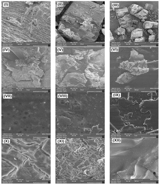 Scanned electron micrographs of samples: (I–III) Cz-β-CD (1:1); (IV–VI) CzP-β-CD (1:1); (VII–IX) Cz-β-CD-AgNPs; (X–XII) CzP-β-CD-AgNPs.