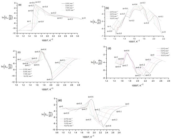 The Friedman method (differential method) can be visually represented through a schematic representation, which includes a detailed description of the steps and processes used to solve differential equations. Figure 14 shows the dependence of on the reciprocal temperature 1000/T at different heating rates (): 2.5 °C min−1, 5.0 °C min−1, 7.5 °C min−1, 10.0 °C min−1. Each curve (Figure 14) corresponds to fixed values of the degree of conversion (α) in the range from 0 to 1. In the initial stages of the process (α = 0.1–0.4), low kinetic activity is observed, which is reflected in the increase in the value of 1000/T. With an increase in the degree of conversion (α = 0.5–0.9), a sharp increase in the value of occurs, which corresponds to the active stage of decomposition or transformation of the substance. At the end of the process (α = 1) the curves gradually decrease, reflecting the reaction slowdown. An increase in the heating rate leads to a shift of the curve peaks towards higher temperatures. This shift is associated with a thermal delay in the reaction process and reflects the dependence of the kinetic parameters on temperature. The graph (Figure 14) illustrates the application of the isokinetic approach to determining the kinetic parameters of the process, including the activation energy, using the differential Friedman method.