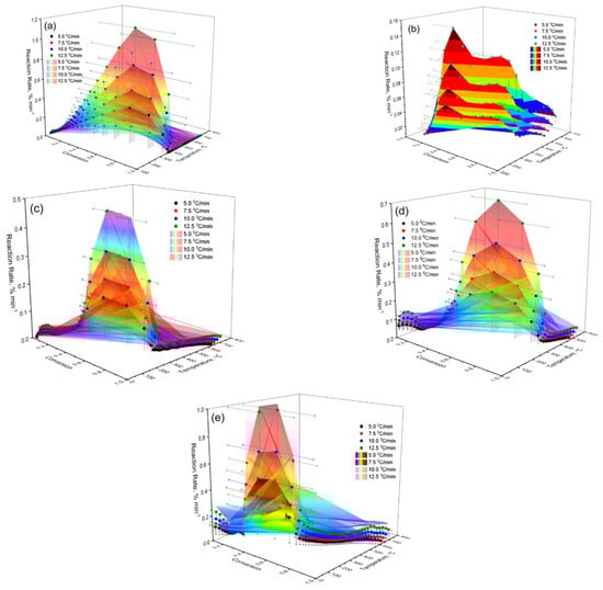 The experimental data on the reaction rate were obtained by calculating according to Equation (4) and are presented in a three-dimensional coordinate system. As can be seen from Figure 15a, the maximum reaction rate is achieved at an average degree of conversion (α = 0.5–0.7). Under these conditions, with an increase in the heating rate, a shift in its peaks to higher temperatures is observed. These data indicate the energy dependence of the process and confirm its multistage nature. The spatial distribution of the reaction rate values on the graph allows visualizing the influence of thermal conditions on the kinetic behavior of the system under study.