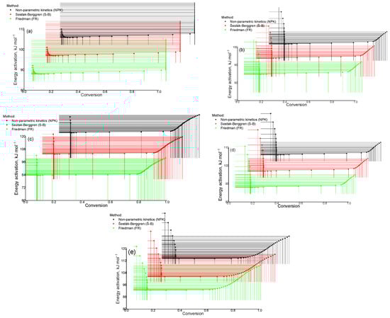 Activation energy (E) indices determined using the methods of nonparametric kinetics (NPK), Šesták–Berggren (SB) and Friedman (FR): Cz (a); CzP (b); Cz-β-CD (c); Cz-β-CD-AgNPs (d); CzP-β-CD-AgNPs (e).