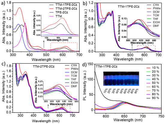 (a) UV–vis absorption spectra of radicals in cyclohexane. (b,c) UV–vis absorption spectra of the radical TTM-1TPE-2Cz and TTM-2TPE-2Cz in different polar solvents. (d) Photoluminescence (PL) spectra (λex = 450 nm) of radical TTM-1TPE-2Cz with different ratios in cyclohexane/polydimethylsiloxane mixed solvent system (1 × 10−3 mol/L), the insect shows the related photographs.