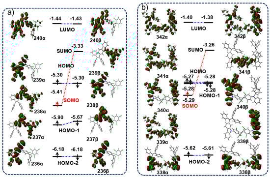 The singly occupied molecular orbital (SOMO) and singly unoccupied molecular orbital (SUMO) of the TTM are mainly localized on the radical TTM unit (Supplementary Materials Figure S2). In contrast, the highest doubly occupied molecular orbital (HOMO) of both radicals TTM-1TPE-2Cz and TTM-2TPE-2Cz is mainly distributed on the electron-donating substituent TPE-2Cz (Figure 4a,b). Notably, the strong electron-donating capability of TPE-2Cz elevates its HOMO energy level to −5.16 eV (Figure S2), which is 0.59 eV higher than the SOMO energy level of the TTM unit (−5.75 eV). This results in the HOMO energy level of the entire radical molecule being higher than that of the SOMO, presenting the SOMO-HOMO-inverted non-Aufbau electronic structure of the radicals [11,35,36]. Considering that the TPE-2Cz unit has stronger electron-donating abilities, it is reasonable that the energy level of HOMO is higher than that of SOMO.