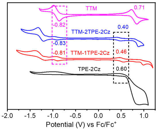 Cyclic voltammetry (CV) curves of TTM-1TPE-2Cz, TTM-2TPE-2Cz, TTM, and TPE-2Cz.