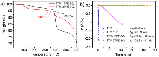 To study the thermal stability of the radicals, thermogravimetric analysis (TGA) was performed on TTM-1TPE-2Cz and TTM-2TPE-2Cz. As shown in Figure 6a, the temperatures corresponding to 5% mass loss for TTM-1TPE-2Cz and TTM-2TPE-2Cz were 382 °C and 340 °C, respectively. These results indicate that TTM-1TPE-2Cz exhibits significantly higher thermal stability than TTM-2TPE-2Cz. In addition to thermal stability, photostability is one of the important parameters of organic radicals. To assess this property, the decay of the absorption peak centered at 375 nm was monitored for both radicals in cyclohexane solution under 365 nm UV lamp irradiation, with identical concentrations and instrument settings. For comparison, the well-characterized radical TTM and TTM-1Cz were also tested under the same conditions. As shown in Figure 6b, the calculated halftime (t1/2) of the TTM-1TPE-2Cz and TTM-2TPE-2Cz in cyclohexane solutions were 19.44 × 103 min and 5.99 × 103 min, respectively. These values were nearly 39,000 times and 12,000 times higher than that of TTM (0.5 min) and 850 times and 260 times higher than that of TTM-1Cz (23.29 min), respectively.