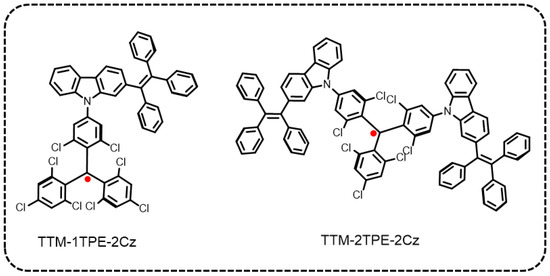 Molecular structure of TTM-1TPE-2Cz and TTM-2TPE-2Cz. The red dot represents unpaired electrons, a common notation for organic radicals in chemical structural representations.