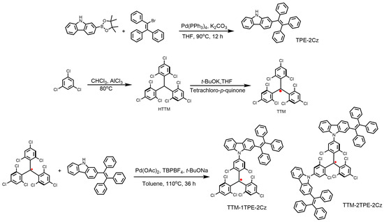 Synthetic procedure of TPE-2Cz and radical TTM, TTM-1TPE-2Cz, and TTM-2TPE-2Cz. The red dot represents unpaired electrons, a common notation for organic radicals in chemical structural representations.