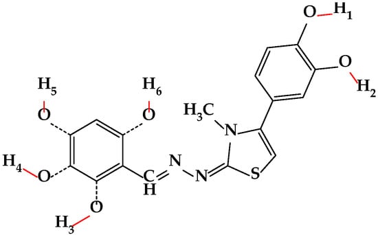 Furthermore, the bond dissociation enthalpy (BDE) for all phenol groups was calculated across all three environments. The molecular sites potentially releasing hydrogen atoms, identified as H1 to H6, are illustrated in the general structure shown in Figure 1. The calculated O-H bond dissociation enthalpies (BDE) for the H1–H6 sites in the studied compounds are provided in Table 5 (vacuum), Table 6 (nonpolar environment), and Table 7 (water).