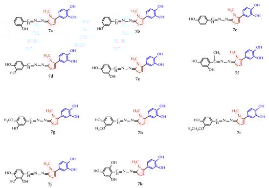 4-((E)-2-(((E)-2-hydroxybenzylidene)hydrazineylidene)-3-methyl-2,3-dihydrothiazol-4-yl)benzene-1,2-diol (7a): pale yellow solid; mp = 243 °C; yield = 58%; FT IT (KBr) vmax cm−1: 1272 (N-CH3), 1602 (C=N), 2951,3118, 3334 (phenolic OH); MS: m/z = 340.8; 1H-NMR (DMSO-d6, 500 MHz) δ: 3.47 (s, 3H, -CH3), 6.72 (s, 1H, Th), 6.79 (dd, 1H, ctc, J1 = 2 Hz, J2 = 8.5 Hz), 6.89 (t, 2H, ctc, J = 2 Hz), 6.90–6.93 (m, 1H, Bz), 6.97 (dd, 1H, Bz, J1 = 1 Hz, J2 = 8.5 Hz), 7.29–7.32 (m, 1H, Bz), 7.62 (dd, 1H, Bz, J1 = 1,5 Hz, J2 = 7.5 Hz), 8.82 (s, 1H, Bz); 13C-NMR (DMSO-d6, 125 MHz) δ: 35.0 (-CH3), 102.0 (TH-C5), 115.9 (ctc), 116.4 (ctc), 116.6 (Bz), 119.2 (Bz), 119.6 (ctc), 120.7 (Bz), 127.9 (ctc), 130.6 (Bz), 131.8 (Bz), 142.2 (Th-C4), 145.6 (ctc-OH), 147.2 (ctc-OH), 149.9 (Bz), 157.5 (Bz-OH), 168.1 (Th-C2).