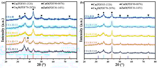 The crystal structure of the catalysts after pretreatment and reaction were characterized by XRD, as shown in Figure 1. Figure 1a compares the structure of catalysts pretreated in different manners. The CZA-H catalyst presented the characteristic Cu2O (PDF78-2076) diffraction peak at 36.3°and Cu (PDF85-1326) diffraction peak at 43.3°. With an increasing CO2 pretreatment time, the peak intensity of Cu diffraction decreased, while the half-peak width increased. CuO (PDF90-0076) diffraction peaks at 35.5° and 38.6° were detected in the CZA-H-C3 and CZA-H-C4 catalysts. These results indicated that the valence state and crystal size of copper species changed during the pretreatment process. The diffraction peaks of Cu2O and Cu were mainly detected in the catalyst after reaction, as shown in Figure 1b. It is to be noted that the crystal structures were similar. This finding showed that the oxidation and reduction rates were different during the reaction. It indicated that increasing the pretreatment time not only led to a change in valence state of Cu species from a highly reduced state to a highly oxidized state, but it also resulted in the variation of the particle size of Cu species. Due to the high reaction temperature, Cu species might be sintered and grow, eventually leading to an alteration in catalyst structure [20]. According to Scherrer’s formula, the particle size of Cu species can be calculated from the half-peak width of the diffraction peak. The grain size of Cu species after pretreatment is between 7 and 13 nm, while the average grain size of Cu species after reaction is about 20 nm, which is in line with the corresponding TEM images. In addition, only weak ZnO peaks and no Al peaks were detected in the XRD pattern. Therefore, we confirmed their content and ratio by EDS mapping imaging (Figure S2 and Table S1).