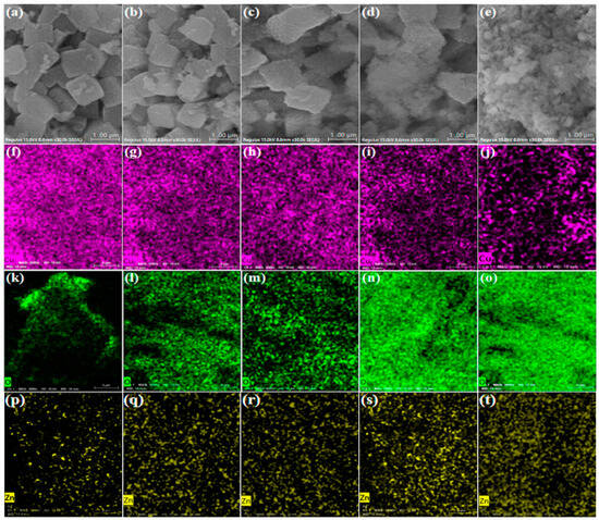 SEM images of the activated CZA catalyst (a–e) CZA-H, CZA-H-C1, CZA-H-C2, CZA-H-C3, CZA-H-C4 and elemental energy spectrum: (f–j) Cu; (k–o) O; (p–t) Zn. (legend: MAG: 3000×, HV: 15 kV, WD: 15 mm).