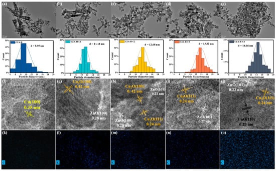 TEM image of activated CZA catalyst: (a–e) low multiple (50 nm); (f–j) high multiple (5 nm). Statistical distribution of particle size and energy spectrum of elements: C (k–o).