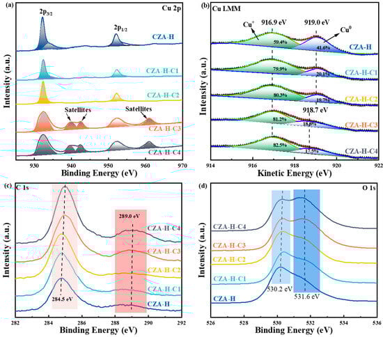 XPS was used to study the chemical states of Cu species on the surface of the CZA catalysts and determine the formation of carbonate species as shown in Figure 4. Figure 4a shows the Cu 2p spectrum of the pretreated CZA catalyst. The CZA-H catalyst primarily displayed two distinct BE peaks, at 932.2 eV and 952.1 eV, corresponding to Cu 2p3/2 and Cu 2p1/2. Upon increasing the CO2 pretreatment time, the CZA-H-C1 and CZA-H-C2 catalysts showed weaker Cu 2p3/2 and Cu 2p1/2 peaks compared with the CZA-H catalyst, indicating that the amount of Cu0 or Cu+ decreased gradually [25]. Due to the small chemical shift of Cu to Cu2O, it was difficult to distinguish them by photoelectron spectral lines alone [26]. The appearance of satellite peaks and the weak shift of Cu 2p3/2 peaks towards a high binding energy in the CZA-H-C3 and CZA-H-C4 catalysts manifested an increase in copper oxidation [27].
