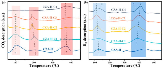 To investigate the catalyst surface and adsorption characteristics, the TPD patterns of CO2 and H2 for the pretreated CZA catalysts are depicted in Figure 5, alongside the data of the CZA catalyst subjected to a CO2-free pretreatment. According to the CO2-TPD, each specimen exhibited three main peak profiles: a small α peak at approximately 100 °C indicative of weak desorption, a moderate β peak at around 200 °C representing moderate desorption and a pronounced γ peak at approximately 370 °C signifying strong desorption [32]. Changes in the peak areas of the samples suggested varying intensities of CO2 adsorption on the pretreated CZA catalysts. The low-temperature peak was associated with surface Brønsted basic sites, such as -OH groups, whereas the medium-temperature peak was related to metal–oxygen pairs [33,34]. The intensities of the α and γ peaks decreased with an increase in the CO2 pretreatment time, indicating that the number of alkaline sites available for adsorption on the catalyst surface decreased. Moreover, the adsorption sites were no longer active due to pore collapse, surface area reduction or chemical reaction or physical blockage [35]. For the moderate alkaline adsorption peak, the peak area slightly changed, but the peak location shifted to the low temperature, indicating that the alkali strength of the adsorption site declined. As to the strong basic interaction, CO2 adsorption substantially influenced the catalytic efficiency for CO2 hydrogenation to methanol [36]. The CO2-TPD desorption peak of the pretreated catalyst was deconvolution calculated, and the results are shown in Table S3. With the increase in CO2 pretreatment time, the amount of CO2 desorption in the low-temperature zone gradually decreased, the amount of CO2 desorption in the middle-temperature zone gradually increased, and the amount of CO2 desorption in the high-temperature zone gradually decreased. In addition, the formation of carbonate was expected to occupy a certain CO2 adsorption site, which also proved the existence of carbonate. H2, being an additional reactant, also exhibits two main desorption peaks in Figure 5b, with the α peak and the β peak at approximately 110 °C and 380 °C, respectively. The α desorption peak at lower temperatures was ascribed to either the physical adsorption of H2 or chemical adsorption at less intense sites, such as surface defects [37]. With the increase in CO2 treatment time, the area of the α peak of the catalyst gradually increased. The high-temperature desorption β peaks corresponded to the strong H2 adsorption at more stable adsorption sites (reduced Cu0 or metal–carrier interactions that might be formed at metal oxide interfaces) [38]. The increase in peak area suggested that the number of sites available for hydrogen adsorption on the catalyst increased, or the adsorption strength of the adsorption site increased. The shift in peak position to high temperature implied that more carbonate compounds were formed on the catalyst surface, which was more favorable for H2 adsorption. According to the spectrogram, it was found that the CZA-H-C1 and CZA-H-C2 catalysts were relatively superior to others in the adsorption and activation of reactants.