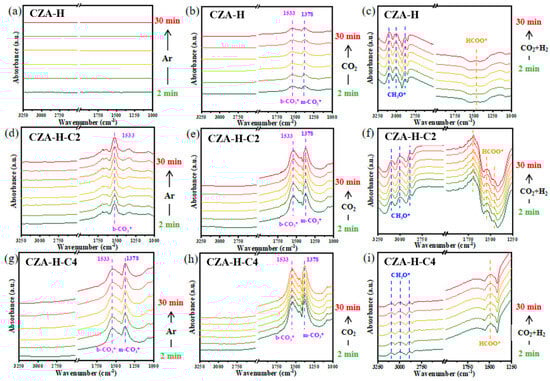 In situ DRIFT spectra of CZA catalysts after different pretreatments: (a–c) CZA-H; (d–f) CZA-H-C2; (g–i) CZA-H-C4 exposed to Ar, CO2 and CO2/H2 atmospheres, respectively.