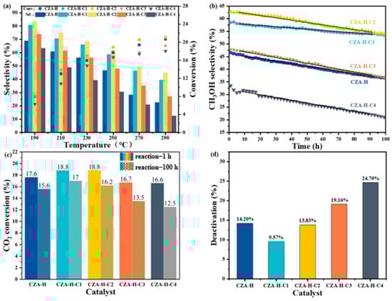 Performance assessment results of CZA catalyst after activation at different CO2 times: (a) CO2 conversion and CH3OH selectivity (reaction conditions: 190–290 °C, 3.0 MPa); (b) CH3OH selectivity change during reaction; (c) comparison of CO2 conversion before and after 100 h of reaction; (d) deactivation degree after 100 h of reaction (reaction conditions: 250 °C, 3.0 MPa).