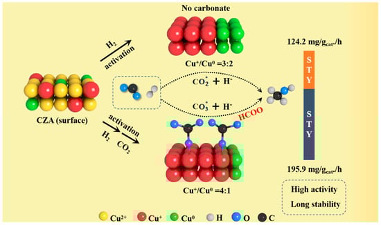 Compared with H2 reduction, the difference with the CO2 pretreatment of Cu-based catalysts is that H2 reduction usually involves the use of hydrogen as a reducing agent, while CO2 pretreatment only uses CO2 in the reaction process to improve the catalytic performance, confirmed by the structural and electronic state changes [57]. According to the above results, the carbonate species were formed on the surface of the CZA catalyst by H2 reduction and proper CO2 pretreatment. Combined with the characterization and evaluation results, the carbonate species played a pivotal role in CO2 hydrogenation to methanol. Firstly, as one of the reaction intermediates, carbonate can induce the reaction into dynamic equilibrium more quickly. The presence of carbonate promoted the adsorption and dissociation of H2, which accelerated the next transition to the intermediate formate [58]. The reaction equilibrium K constants at 250 °C and 3 MPa are listed in Table 4. The standard equilibrium constant of CO2 hydrogenation to methanol under this condition was 1.55 × 10−3. With the increase in carbonate species on the catalyst surface, the reaction equilibrium constant was closer to the standard value. According to the results of the experiment and characterization analysis, the core content of this work is converted into graphic form, as shown in Figure 8. It can be seen that a Cu-based catalyst modified by surface carbonate was more favorable to the CO2 hydrogenation to methanol reaction. In addition, carbonate species formed on the surface of the Cu-based catalyst can also be used as a physical structural agent to protect the active sites and avoid agglomeration and oxidation. Carbonate can form a stable coating layer on the catalyst surface, which can effectively reduce the direct contact between Cu particles and inhibit the agglomeration of Cu [59]. Additionally, the carbonate coating protected Cu species from oxidizing agents. In an oxidizing environment, the carbonate layer can prevent the contact of oxygen with Cu species, thus reducing the oxidation of Cu. This can be proved by the calculation of the deactivation degree after 100 h tests. The deactivation degree of the CZA-H-C1 catalyst was 4.63%, which was inferior to the CZA-H catalyst.