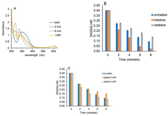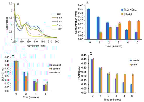 Histidine is a well-characterized 1O2 scavenger, and it reacts with 1O2 to form an oxygenated species, oxo-histidine, thereby removing O2 from the solution [24,25,26]. Consequently, Figure 1C shows that the rate of 1,2-NQ photoreduction increased at 2 and 4 min when 1 mM histidine was present. With less O2 available, re-oxidation of the 1,2-NQ hydroquinone would be limited. Decreased H2O2 for histidine-treated samples was confirmed because, when HRP was added to histidine samples after irradiation, the resultant increase in A415 was ~half that of untreated samples.