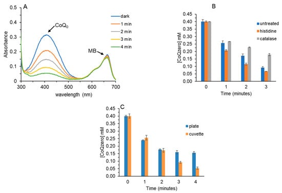 Photoreduction of CoQ0 by MB/EDTA. Reactions (1 mL) contained 0.4 mM CoQ0, 2 μM MB and 2 mM EDTA in 10 mM PB pH 7.4 (2% DMF final). (A) UV/Vis scans were collected prior to (dark) and after irradiation. (B) Samples were prepared as in (A). Histidine (1 mM) or 1 μM catalase were included prior to irradiation. The decrease in A405 was used to calculate [CoQ0] at each time. These data are the average of two independent experiments performed in triplicate. (C) Samples were prepared as in (A), and 100 µL portions were irradiated in a 96-well plate. A405 was measured prior to and after light exposure. The cuvette data are identical to that shown in (B). These data are the average of three independent experiments performed in triplicate.