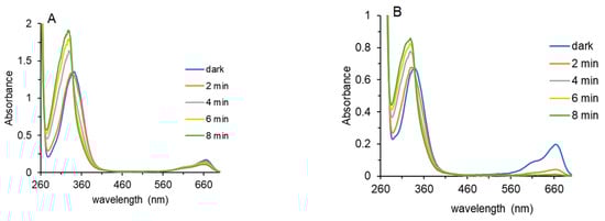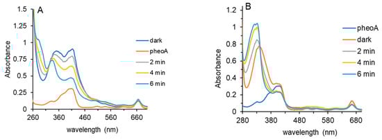 The menadione photoreduction spectra are shown in Figure 5B. As in Figure 5A, the spectrum of pheoA is included. Because the absorbance maxima of oxidized and reduced menadione are at lower wavelengths than pheoA, the photoreduction of menadione is easier to observe than for 1,2-NQ (Figure 5A). With only 2 min of light treatment, the photobleaching of pheoA is observed with decreases in absorbance at ~410 nm and at 665 nm. No further decreases in pheoA absorbance occurred at 4 or 6 min. The photoreduction of menadione was complete after 6 min. Identical concentrations of quinone (1,2-NQ or menadione), pheoA and TEOA were used for the experiments shown in Figure 5A,B. Menadione was photoreduced to a greater extent than 1,2-NQ.