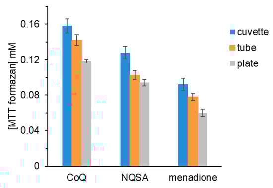 All of the quinones, when photoreduced, yielded a color change when combined with MTT; no PMS was required. Figure 6 shows the results of these experiments for CoQ0, NQSA and menadione. Samples of each quinone in the three experimental configurations were photoreduced concurrently. Based on our experimental design, the highest possible formazan concentration was 0.16 mM. For CoQ0, that was achieved only in the cuvette with lower formazan yields for CoQ0 photoreduced in a microfuge tube or plate well. This trend of highest MTT formazan concentrations in the cuvette, followed by the tube and plate, is evident for NQSA and menadione as well (Figure 6). When hydroquinone, the stable reduced form of 1,4-benzoquinone, was combined with MTT, no reaction occurred. Likewise, samples that contained MB, EDTA and quinones but that were not irradiated did not react with MTT.