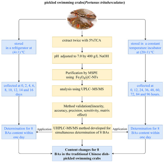 In this study, we developed an efficient and accurate UHPLC-MS/MS method for the analysis of eight BAs in crab samples using Fe3O4@C-NFs as the MSPE adsorbent. The analytical performance of the method was assessed in terms of linearity, accuracy, precision, the limits of detection and quantification. Subsequently, the established method was applied to investigate the changes in the eight BAs in pickled swimming crabs (Portunus trituberculatus) stored at two different temperatures (4 °C and 20 °C). This research demonstrates the feasibility of the non-derivatization pretreatment of BAs using MSPE, streamlining sample preparation and reducing organic solvent use in aquatic products. The findings of this study are valuable for enhancing the quality control of pickled swimming crabs and have practical implications for promoting healthy dietary choices.
