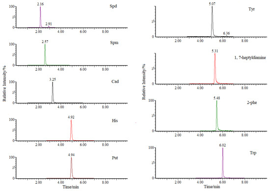 Biogenic amines (BAs) are basic polar or semi-polar nitrogenous compounds, with a small molecular weight, and they persist in a variety of foods and beverages, such as seafood and its products [1,2], fermented products [3,4,5,6], vegetables [7], and soybean products [8,9,10]. The main BA formation pathway is the decarboxylation of free amino acids by microorganisms, where the α-carboxyl groups are removed from precursor amino acids; the second is the amination or transamination of aldehydes and ketones [11,12,13]. The most commonly generated BAs in food include tyramine (Tyr), 2-phenylethylamine (2-Phe), histamine (His), tryptamine (Trp), spermidine (Spd), spermine (Spm), cadaverine (Cad), and putrescine (Put).