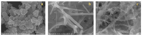 The surface morphology of Fe3O4, C-NF, and Fe3O4@C-NF composites was investigated using SEM, as shown in Figure 3. The SEM images revealed that Fe3O4 particles were uniformly distributed on the fiber rods of C-nanofibers, and the Fe3O4@C-NFs composites exhibited a large surface area with numerous sorption sites. Brunauer–Emmett–Teller (BET) surface area and total pore volume of the composites were 30.7 cm2/g and 0.30 cm3/g, respectively, indicating that the Fe3O4@C-NF composites have large specific surface area and a uniform pore radius distribution. Further characterization results for these materials can be found in our previous studies [40].