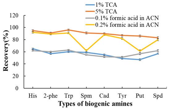 The extraction solvents commonly used for biogenic amines (BAs) in aquatic products include trichloroacetic acid (TCA) [28], perchloric acid (HClO4) [29] and acetonitrile [42] in previous studies. Aquatic products contain impurities, such as protein, fat, mineral elements, etc.; therefore, a suitable extraction solution should not only efficiently extract BAs but also effectively precipitate proteins. BAs are mainly water-soluble small molecules. Spm and Spd are insoluble in acetonitrile. HClO4 is highly corrosive and harmful to the human body, which led to the exclusion of both acetonitrile and HClO4 from our study. Aqueous solutions of TCA at varying concentrations (1%, 5%) and acetonitrile with different proportions of formic acid (0.1%, 0.2%) were evaluated for extraction. Fresh portunculus triverruca purchased from local market served as the biological sample, to which a specific volume of a mixed standard BA solution was added. Recoveries were evaluated to examine the efficiency of different extraction solvents. Recoveries were determined by spiking the samples with the eight BA mixed standard solutions and calculated as measured content vs. fortification level. As illustrated in Figure 4, extraction efficiencies using a 1% TCA solution and 0.1% formic acid in acetonitrile (v/v) resulted in low yields for each BA. The extraction efficiencies using 0.2% formic acid acetonitrile (v/v) yielded poor results for Spm and Put. In contrast, better extraction efficiencies for all eight BAs were achieved using 5% TCA solution, which was ultimately selected as the final extraction solvent. Given that BAs have low molecular weights and high water solubility, acidic reagents can effectively interact with proteins to form insoluble salt precipitates, thereby reducing interference. The concentration of 1% TCA was insufficient for effective protein precipitation, while a 5% TCA solution achieved extraction efficiencies exceeding 80% for all eight BAs.