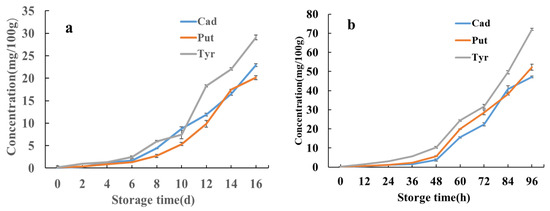 The effects of storage temperature (4 °C and 20 °C) and storage time on the contents of BAs in pickled swimming crabs were studied. The concentrations of eight BAs formed during storage are indicated in Table 3 and Table 4. The changes in Cad, Put and Tyr during storage are shown in Figure 6.