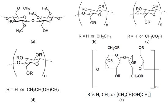 Cellulose ether derivatives methylcellulose (MC) (a), ethyl cellulose (EC) (b), carboxymethylcellulose (CMC) (c), hydroxypropyl cellulose (HPC) (d), hydroxypropyl methylcellulose (HPMC) (e) [39].