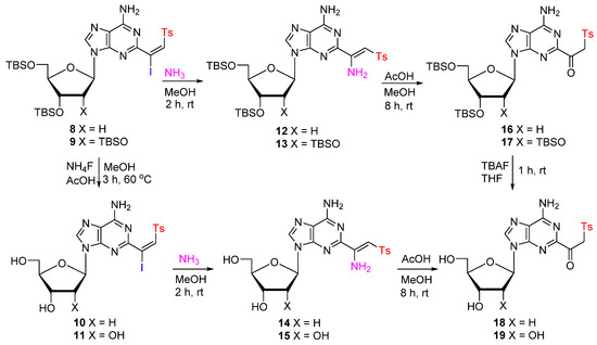 We initially attempted iodosulfonylation [35,36] of 5 with the I2/TsNa/NaOAc [37] (MeCN/80 °C) protocol, which was successful for the iodovinylsulfonylation of 8-alkynyladenine nucleosides [31]. However, the isolated product was identified as 2-(iodoethynyl)-2′-deoxyadenosine 7 (80%; Table 1, entry 1). An analogous reaction in the absence of NaOAc in H2O or H2O/MeCN mixture also provided 7 but with lower yields (entries 2 and 3). It is noteworthy that such iodination of the terminal alkyne was also observed with 8-ethynyl-2′-deoxyguanosine but not with the adenine counterpart [31]. Also, iodosulfonylation of 5 with TsNHNH2/KI/benzoyl peroxide failed to give the expected product 8, resulting only in partial removal of the TBS-protecting groups (entry 4), although these conditions were successful with 8-alkynylguanine nucleosides [31]. The use of CuI as a source of iodide (entry 5) and application of other methods [38,39,40,41] were also not successful (entries 6 and 7). Furthermore, treatment of 5 with freshly prepared TsI [42] in THF, although it effected iodosulfonylation, resulted mainly in the cleavage of the glycosidic bond (entry 8). However, a similar iodosulfonylation of 5 with TsI (2 equiv.) in the presence of NaOAc (3 equiv.) afforded the expected iodovinylsulfone 8 as a single E-isomer (81%; entry 9). Analogous treatment of the adenosine substrate 6 gave 9 in even higher yield (E; 92%, entry 10). This condition has a general character and was also successful for the iodosulfonylation of 8-alkynyl nucleosides. For example, treatment of 3′,5′-tri-O-(tert-butyldimethylsilyl)-8-ethynyl-2′-deoxyadenosine with TsI in the presence of NaOAc gave (E)-3′,5′-tri-O-(tert-butyldimethylsilyl)-8-(1-iodo-2-tosylvinyl)-2′-deoxyadenosine [31] in 78% yield.