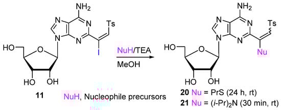 Reactions of 2-(β-iodovinyl)sulfone of adenosine with nucleophiles.