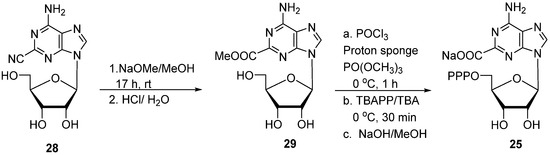 To verify the structure of 2-CATP 25, an independent synthesis of 25 was undertaken. Our initial effort to oxidize 2-methyladenosine [6] with basic KMnO4 at reflux failed to produce adenosine-2-carboxylic acid. Also, hydrolysis of 2-cyanoadenosine 28 [50] with NaOH did not succeed in producing adenosine-2-carboxylic acid. However, treatment of 28 with NaOMe, followed by hydrolysis with dilute HCl (aq), afforded the corresponding methyl ester 29 (80%; Scheme 7). 5′-Phosphorylation of 29 and hydrolysis of the carboxylic ester with aqueous NaOH afforded 25 in a 25% yield after Sephadex purification. Triphosphate 25 prepared using both methods (Scheme 5 and Scheme 7) has identical NMR spectra, and its structure was also confirmed by HRMS (High-Resolution Mass Spectrometry). Analogues 24 and 25 can be considered as displaced isoguanosine analogues [51] in which the 2 carboxylate group can be involved in hydrogen bonding, instead of the C2 keto group present in isoguanosine [51,52]. The reactive carboxylic group can be explored for further bioconjugation [53,54,55] with reactive fluorescent amines and DNA–protein crosslink.
